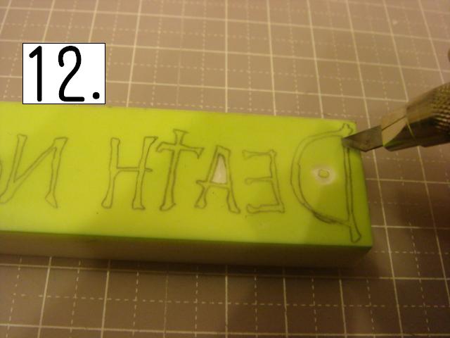 鉛筆の持ち方を崩さずに。 8.上手く○に沿ってカッターを 進められない場合は このように少しずつ。 9.○の周りが彫り終わったら、さらにその周りを彫ります。 さきほどとは、消しゴムの回転を逆にしてください。 10.時計回りです。 11.○の線を越えないように深く彫り過ぎないようにしてください。 くりぬいていきます。 直線は一気にスッと。息を止めて! 慎重に、ゆっくり彫ってください。 消しゴムを回しながら、 彫る手にもスナップを! 今までの画像を見て分かるように、 カッターの刃は 常に自分の方を向いています。 今回はここまでです! なかなか進んでいないような感じがしますが、 しかもなんか途中っぽいですが、まあ、気にしないでください。 これから真選組年賀状彫ります! 日付が変わる頃にはUP出来たらいいなと思います。 PR この記事にコメントする