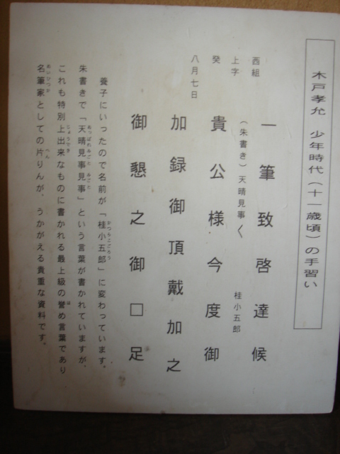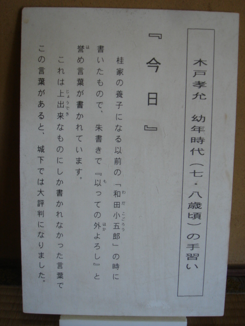 ここで生まれて、20歳まで住んでいたそうです。 部屋がいくつもあって、広い。 ウマ過ぎ。筆に迷いがないもの。 この、先生の褒め言葉 「以(も)っての外(ほか)よろし」って オモシロ過ぎ。 なにこれ、習字の先生より上手。 11歳でこれって。 またしても先生の褒め言葉 「天晴(あっぱれ)見事見事」って オモシロ過ぎ。 ヅラの家のトイレを借りている気分で使ってきました。 そこに咲いていた花。 桂の家から歩いてすぐのところに、高杉の家があります。 門と井戸。 高杉が子供のころよく遊んでいた寺。 この天狗(かなりでかい)を 見て、度胸を付けたんだそうです。 実際の高杉、桂じゃなくて、 銀魂のあの幼少時代の2人しか思い浮かんでいませんでした。 すべてにおいてカワイイ。 その後色々な家を周り、 昨日は時間が無くて全部見られなかった博物館にまた行きました。 PR