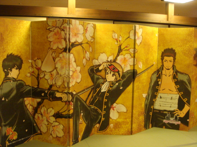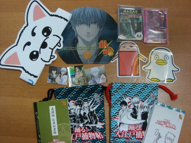←コレが迎えてくれました。 将ちゃんのパンツ。 行方不明になった将ちゃんを探すという体で スタンプラリーをやります。 たくさんありました。 写真には写らない美しさがありました。 所々にキャラのパネルが散りばめられていて、 個人的には全蔵があったのがとても嬉しかったです。 ハニー大作戦中の近藤さんがいました。 実に良く出来ていて、本物そっくり。 って本物って何だよ? 今にも動き出しそうな近藤さんでした。 コレが一番興奮しました。 ↑これがスタンプラリーの台紙で、上が真選組で、下が万事屋。 スタンプコンプリートで ちなみに、スタンプラリーの台紙は 巾着入りでお得です。 これらが戦利品。 あと、真ん中のちっちゃいステッカーが、 飲食店で銀魂メニューを食べると もらえるもの。 ミニゲームは、ジャスタウェイを爆発させないようにするゲームと、 クナイ投げゲーム、マダオの温泉卓球ゲームがあり、 成功したら、左上の定春のとか、銀さんのうちわとか、 エリーとジャスタウェイのシールが貰えます。 失敗したら吉原の広告付きポケットティッシュとかが貰えます。 お土産は、エリーの温泉まんじゅうと、湯上りサイダーと、 フルーツオレキャンディと、入浴剤と、あと載っていないけど桶を買いました。 とても楽しい、夢のような1日でした。 なんか、うわさではまた秋にやるみたいなことを言っていたようないないような。 今回、銀魂友達が風邪で行けなかったので、一緒に行きたいけど、 「また来た」とか思われるんだろうな。 以上、「楽しかった夏の思い出’11」をお送りいたしました!