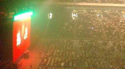 読んでもなんのこっちゃ分からないと思います。 ごめんなさい。 でも私のこのテンションは止められないので、 興味ない方がほとんどだと思いますが どうぞすっとばしてください!! さいたまスーパーアリーナ1日目 400レベルって席の名前、レベルって何?って思ったのですが、 ただ単に4階ってことらしいです。 物販会場にスクリーンがあって、始球式の模様とか 写真撮ってるところとか、新広島球場での映像が流れていました。 なんて粋な計らい。 で、EBIがぶつけたところで笑いがおきてました。 今にも落ちそうなほど急な席でした。 毎度おなじみ席からの眺望@携帯。 It's a 豆粒。 幕が落ちた後、何を着ているのか分からなくて 3曲目でスクリーンに映ったのを見てからしばらくして 石川遼くんの格好をしているんだと分かりました。 あのグラサン付きサンバイザーに白のポロシャツに青いズボンで、 日曜日のおとうさんみたいな格好でした(再び)。 みんな遼くん仕様のヅラを付けていて、最初EBIが髪切ったのかと思いました。 豆粒状なもんですから、ずっとスクリーンを見ていました。 それにしても、最近のスクリーン事情。鮮明。 物凄く綺麗に映るので、それだけで十分でした。 曲は水戸と同じでした。 民生がしきりに「大宮ー!」と叫んでいたのですが、 「ここは大宮じゃなくて与野なんじゃね?」 ってずっと思っててどうも乗り切れませんでした。 「さいたまー!」って言ってくれれば良かったのに。 アンコールはやっさんじゃなく、テッシーでした。 分かりづらい! 阿部がメンバー紹介をするとき、 ギターテッシー!ボーカル&ギターテッシー!ベーステッシー! ドラムテッシー!とかみんなテッシーでした。 ここでもテッシー仕様のヅラ装着。 本人もテッシーのヅラ。 チリチリの毛が口に入るらしく、阿部が「チン毛が口の中に入る」 と言ってて、行きの電車で読んだ銀魂5年生と見事にシンクロしました。 gdgdよりskskやるほうが疲れないということに気付いたのか、 無駄なしゃべりが少なく感じました。 無駄なのが嬉しいのに。 明日は、さいた真横で今日より見えないと思いますが、 なんといっても自転車泥棒! 楽しみ楽しみ! メガネ男子もどこかにいたと思いますが、 今回は一切連絡を取らなかったので、ネタ0です。 今までずっとGWは仕事で他人のために頑張ってきたので、 今年は自分のために使うことが出来て、とても嬉しいです。 まあ、4、6、8、9、10日は仕事ですけど。 あー仕事なんて。 仕事なんてー。