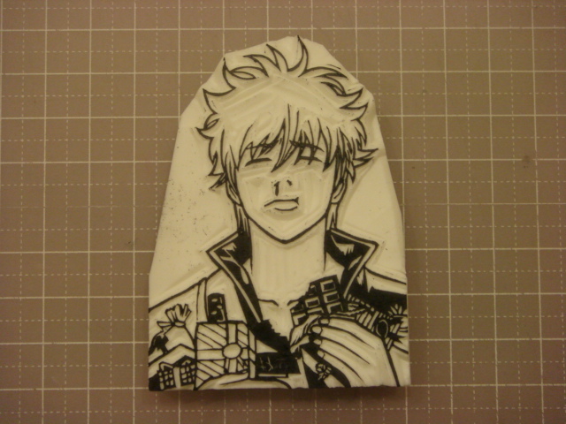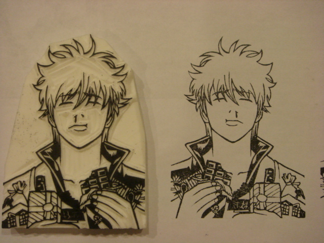 1はんこに1消しゴム消費していて、その余白の部分の消しゴムが 大量に余っていて、これを消費しなければいけません。 これからは、小さいはんこをたくさん彫っていこうと思います。 多分、去年の今頃銀さんが夢に出て来て、それから惚れたので、 銀魂1周年です。 ずーっと単行本が家にあったのに、見向きもしなかた事、 そして、その買っていた本人に 「いい歳して漫画なんか買うんじゃない!」とか言って 買うのを止めさせてしまった事、大変悔やまれます。 そのせいで、13巻からは結局私が一気に買い揃えました。 今となっては私のほうがハマっている始末。 まだまだ新参者ですが、どうぞよろしくお願いします。 漫画って、歳とか関係ないんだね。 少年の心を持っていたら読んでもいいんだよね☆ 5月にはブログ1周年。 なにかプレゼント企画を考えます。 そして、もうすぐステッカーはんこの抽選。 応募した方、お楽しみに!!