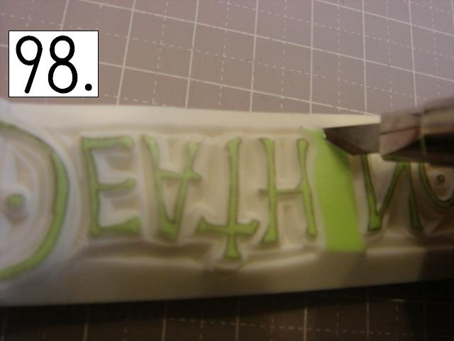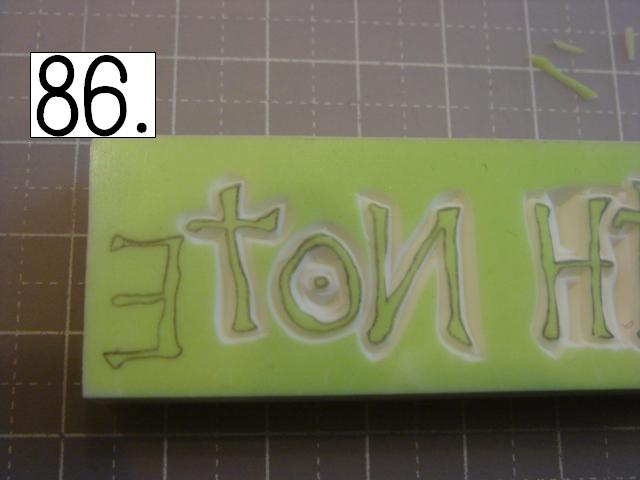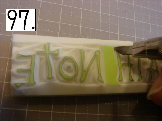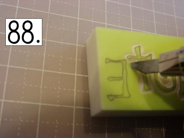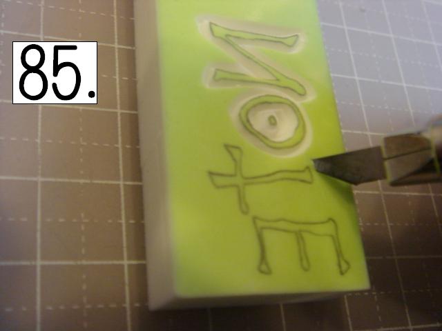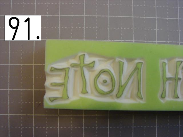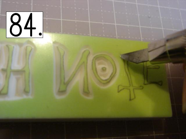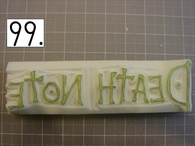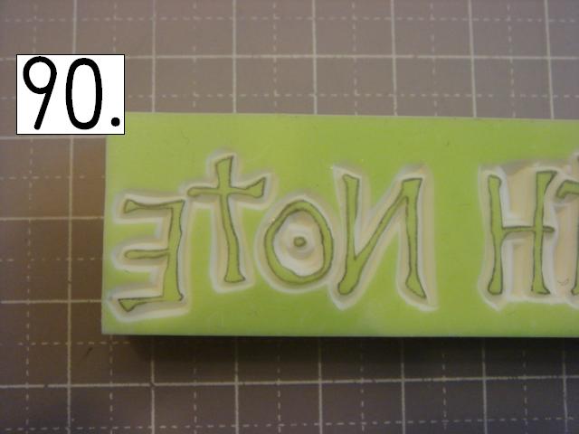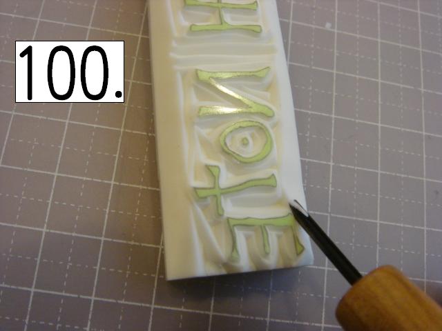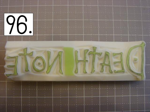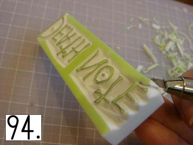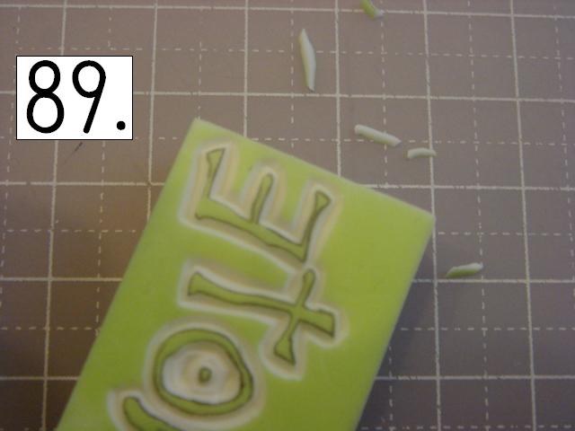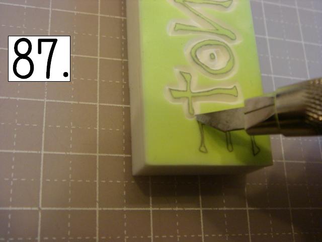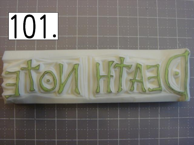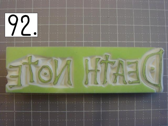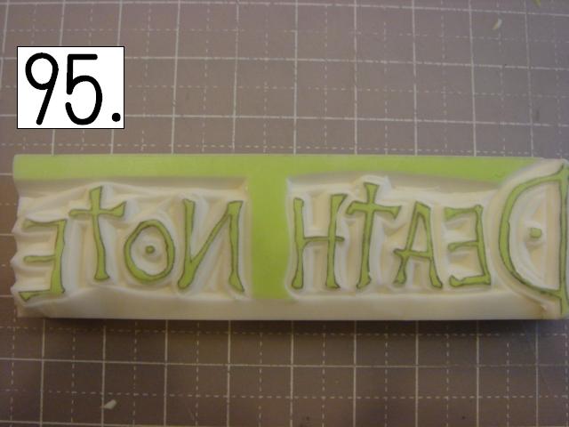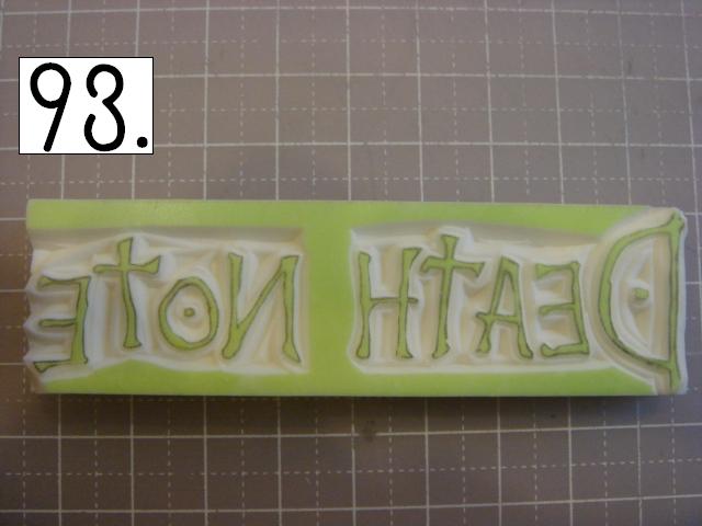 ガタガタなのが味が出るので、 あえて少し手をブルブル震わせてみたり、 カッターの向きを少しだけ変えてみたりしてください。 やりやすいところから攻めてください。 OとTの間とか、TとEの間とか、 割とざっくり行きやすい所を探して、 どんどん彫り進めていきます。 こんな感じに。 右手(利き手)に持ったカッターで 一気に繊細かつ大胆に削ります。 文字を削らないように注意してください。 危ないと思ったら少しずつでも大丈夫です! 94の画像は右手が消しゴムを支えている感じで写っていま すが、 実際は鉛筆を持つように、カッターをしっかり握って ぶれない様にしてください。 この辺まで来ると、押したくてウズウズしてきます。 一回では無理なので、 何回かに分けて彫ります。 浅めに。といっても浅すぎず、深すぎず。 平らにしていきます。 今日はココまで! 次回はいよいよ初版! どんな風になるか気になるかい? じらすよ、私は。Sだからね。 ではでは。 |