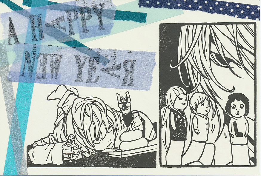 まだ寝たくないので、年賀状画像を。 もう、画像が粗くて収拾が付かないので、 なんとなくで見てください。 今より、この頃の方が 丁寧です。 もっと丁寧に彫ろうと思いました。 はんこの面積が広いので、 賑やかな感じになりました。 Lもメロもいてお得な感じ。 チョコレートをイメージして こんな色を使いました。 デスノートは線に強弱があって、 それを表現するのが難しいです。 単純な一本線じゃないところが。 デスノートの動画もまだまだ続けますので、 よろしくお願い致します! 年々、矢の如く光の如く1年が過ぎていくんですけど。 と、そんなこんなでAM4:20。 そろそろ寝ないと。 あけましておめでとうございます。