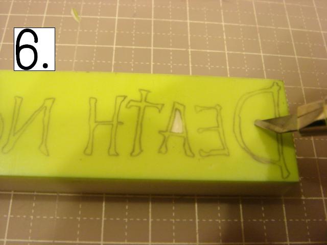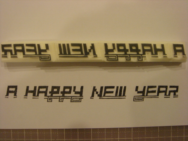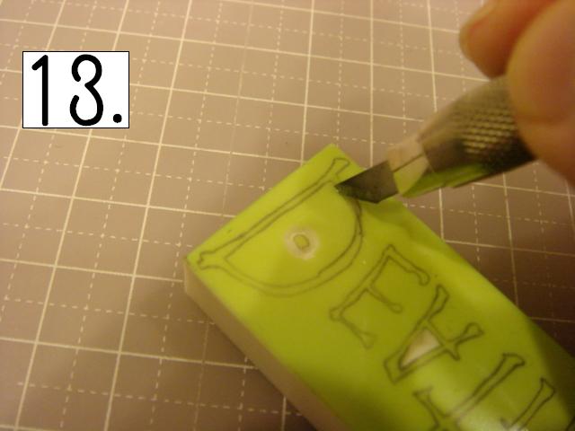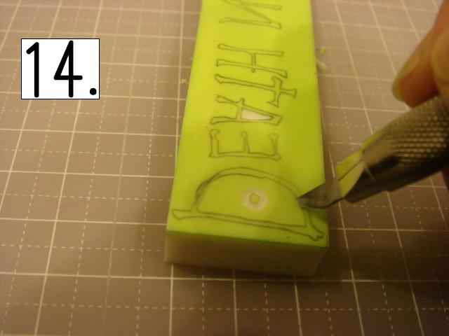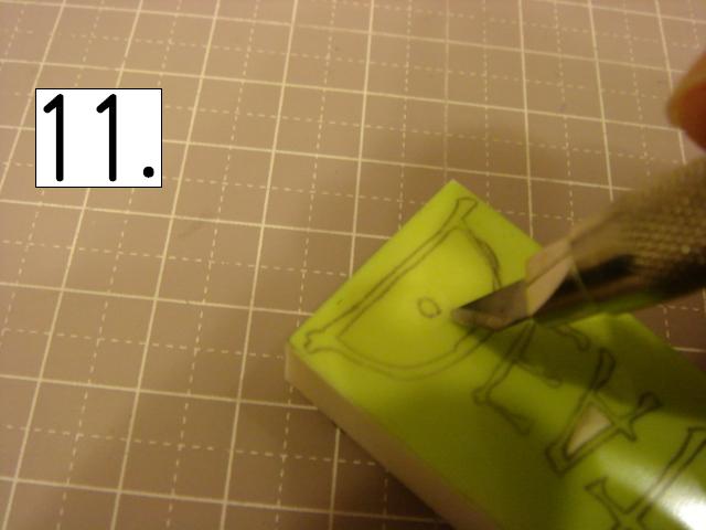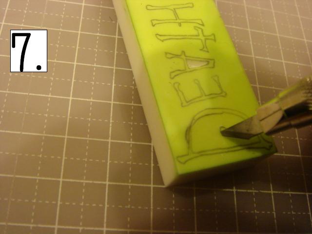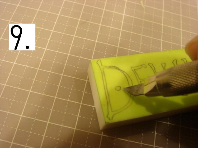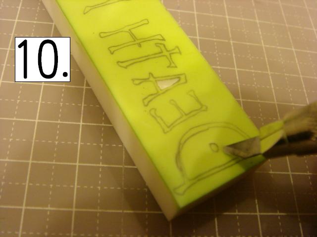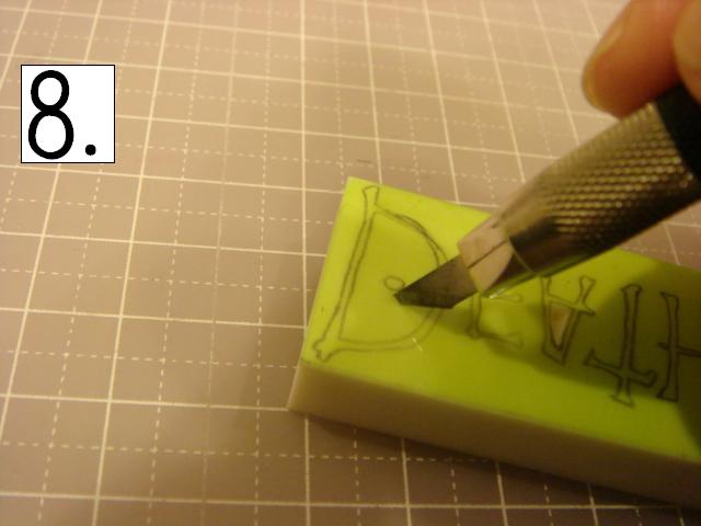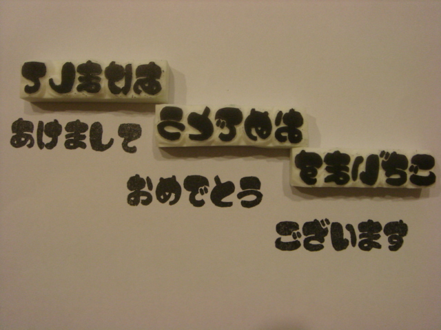 鉛筆の持ち方を崩さずに。 8.上手く○に沿ってカッターを 進められない場合は このように少しずつ。 9.○の周りが彫り終わったら、さらにその周りを彫ります。 さきほどとは、消しゴムの回転を逆にしてください。 10.時計回りです。 11.○の線を越えないように深く彫り過ぎないようにしてください。 くりぬいていきます。 直線は一気にスッと。息を止めて! 慎重に、ゆっくり彫ってください。 消しゴムを回しながら、 彫る手にもスナップを! 今までの画像を見て分かるように、 カッターの刃は 常に自分の方を向いています。 今回はここまでです! なかなか進んでいないような感じがしますが、 しかもなんか途中っぽいですが、まあ、気にしないでください。 これから真選組年賀状彫ります! 日付が変わる頃にはUP出来たらいいなと思います。 |