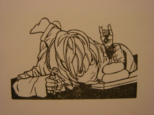本棚の下にありました。まさに灯台下暗し!! お騒がせいたしました。 今月、第3新東京市の温泉に行くつもりだったんですけど、 中止になりました。 心置きなくはんこが彫れます。 頑張ります。 ところで、せめて英語が話せるようになりたい。 あー、情けない。 自分の思っていること、 伝えたいことが相手に通じない、このもどかしい気持ち。 勉強しようかな。 ジェスチャーの限界点が見えました。
