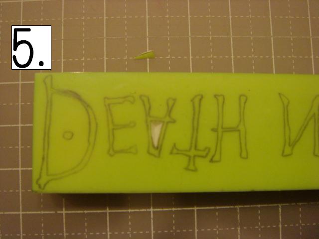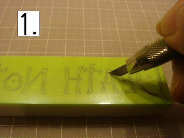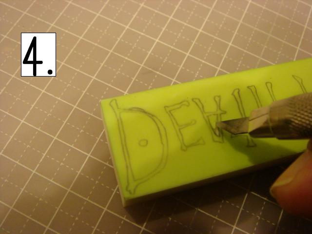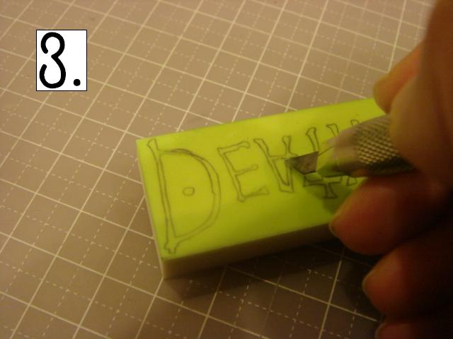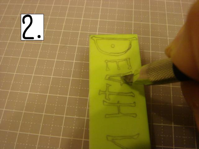 どこから彫っても構いませんが、比較的簡単な「A」の中から。 私は右利きです。 左利きの方は、頭の中で反転させて見てください! この、ななめの感じを崩さずに、 グサッと刺し、スーッと切ります。 2.消しゴムの向きを変えて、下の線 3.さらに向きを変えて反対側の線。 常に、上から下に向かって切るようにして下さい。 4.カッターですくい上げて取ります。 5.できました! 今日はここまでです。 本当はもっと進めたのに、 PCエラーで全部飛んでしまいました。ああ。 そして私の手、初公開!あんまり見ないで! 右手でカッター、左手で撮影。なんとも滑稽な様子でした。 それでは、次回をお楽しみに!! 今月に入って、ひとつもはんこを彫っていません。 |