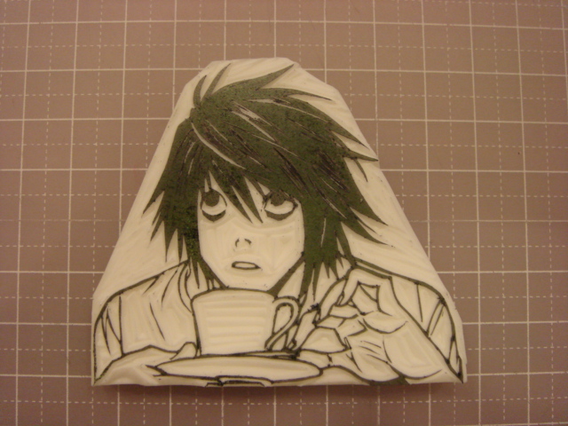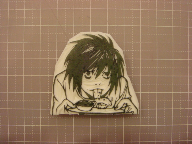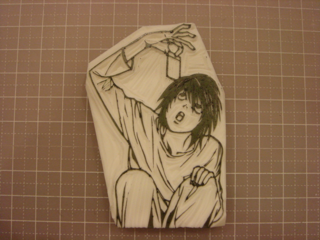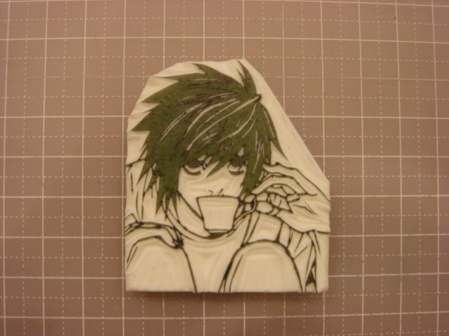 どんだけ彫れば気が済むんだと。 まだまだです。Lはまだ続きますよ。 良い表情がたくさんあって 選ぶの大変でした。 Lは指が長くて良い。 たまに、なんで私はこんなにはんこ彫っているんだろう?と 思うことがあるんですが、 私は、プレゼントする為に彫っているのです。 私のはんこで喜んでいただけるのなら、 私も喜んではんこ彫ります。 応募してくださる皆さんの手にはんこが渡り、 応募の数が0になるまで、彫りたいと思っています。 そんな気持ちです、今は。 その前にお金が尽きるかも知れませんが。。。 メロはんこ、全部郵送済みなんですが、 「届いた」のご連絡が無い方が何人かいらっしゃいます。 嬉しくなかった?予想してたのよりショボかった? もしかして届いてない?とか気になるので、 今度のニアはんこ以降は、たとえ嬉しくなくても、 「届いた」のメールは下さい!! ちょっとした大人のマナーです! よろしくお願い致します。