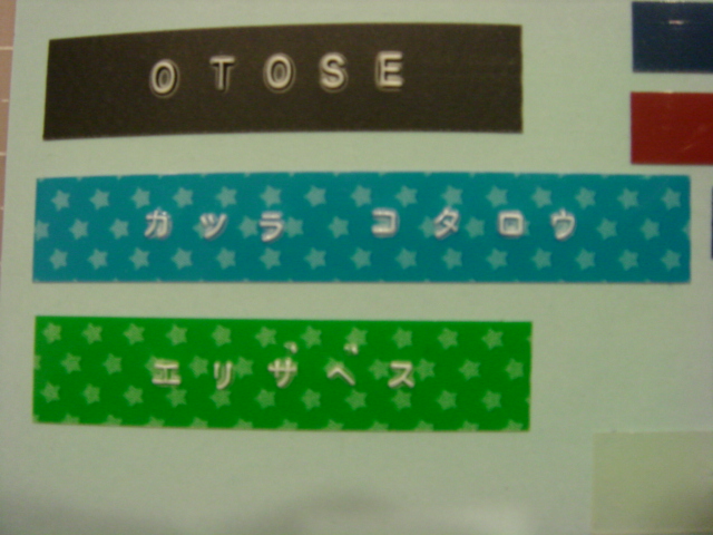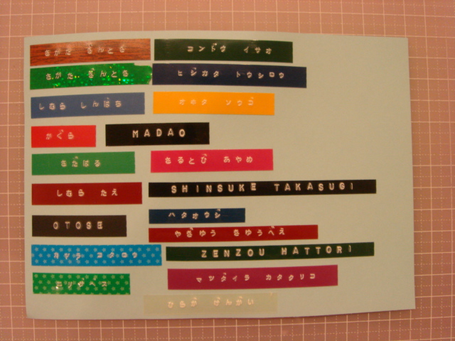 使わなくなったので、数年前、譲り受けました。 それで、銀魂キャラの名前作りました。作るっていうのか?印字? 一応、カタカナとひらがな打てるんですが、 ちっちゃい「つ」とか、「や」とかが無いので、 「やぎゆう きゆうべえ」とかになっちゃいます。 星のテープは今日買いました。カワイイ。 今は、色々な柄のテープがあって、楽しいです。 はんこ1個彫るプレゼントの名前は、 私の下手な字はやめて、このテープで印字したものを貼ります。 そして、きょう彫ったはんこ。 市松定春。 きょうはこれだけ。定春カワイイ。 毒キノコクンクンしてくしゃみしてる顔、大好きです。 |